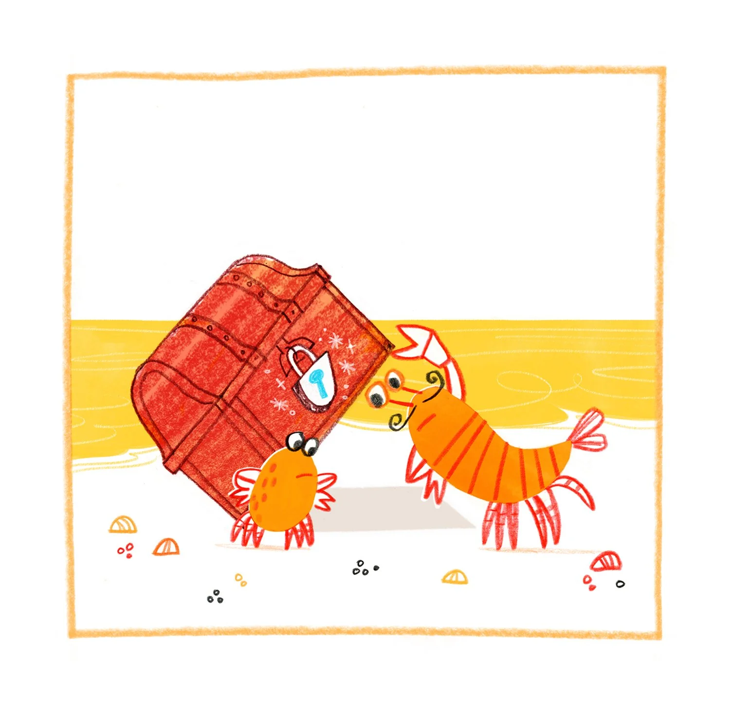 Three cheerful orange crabs dancing on a stage with a blue curtain, surrounded by dark blue crabs watching, with red and blue dots and stars in the background.